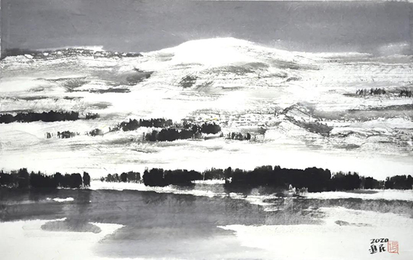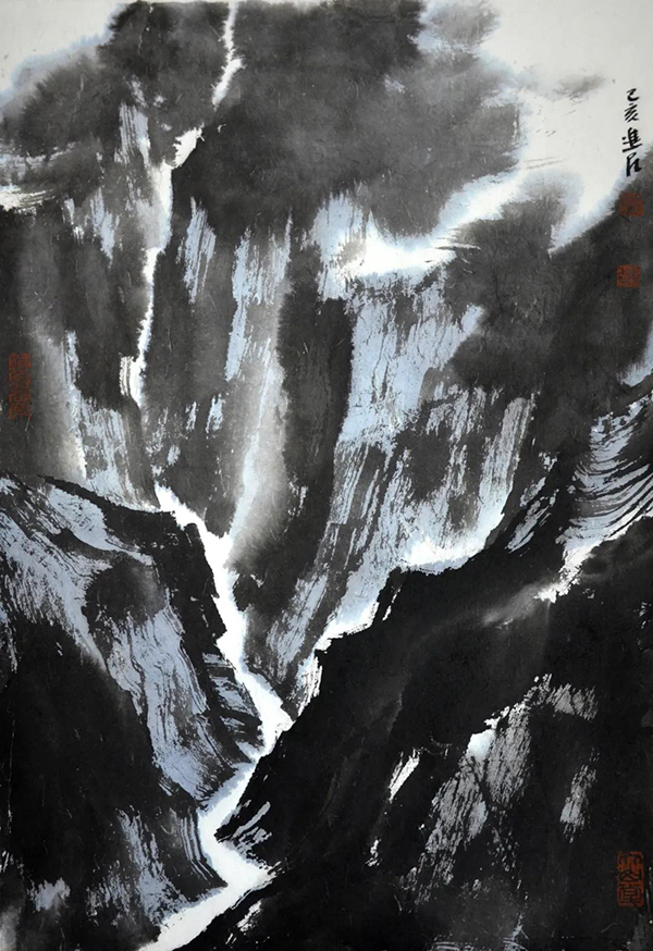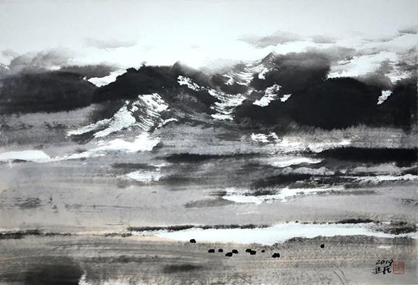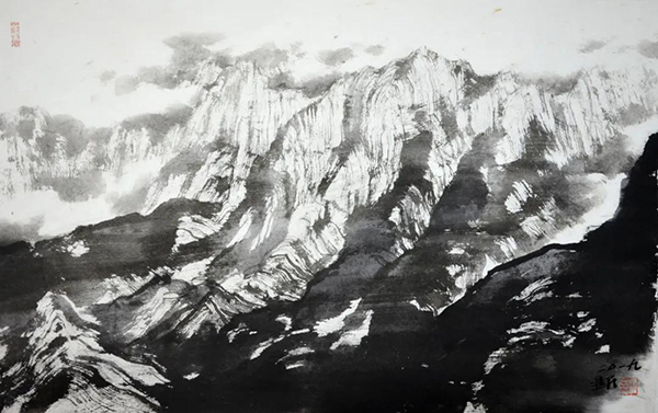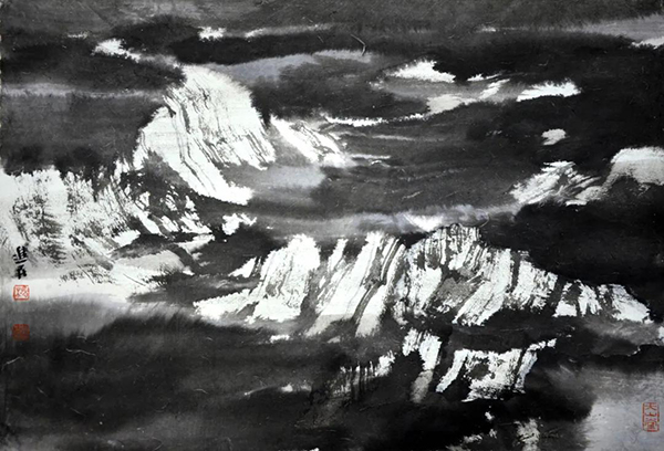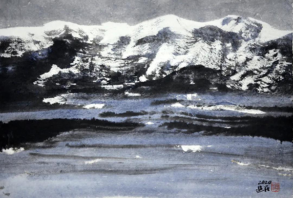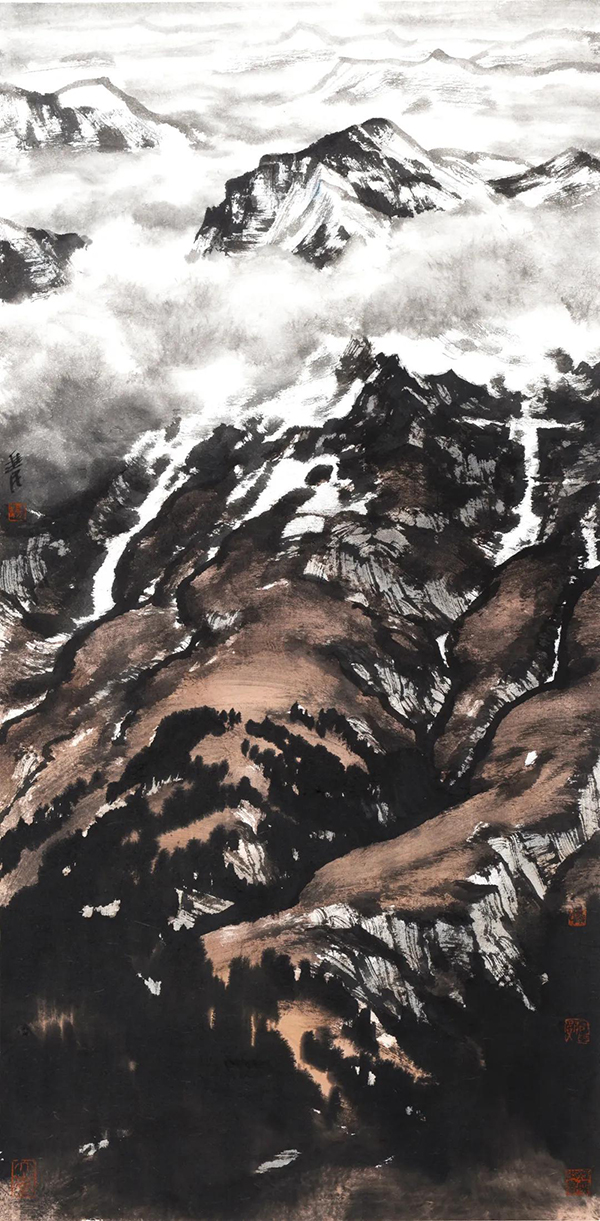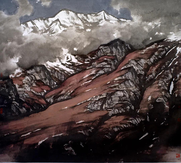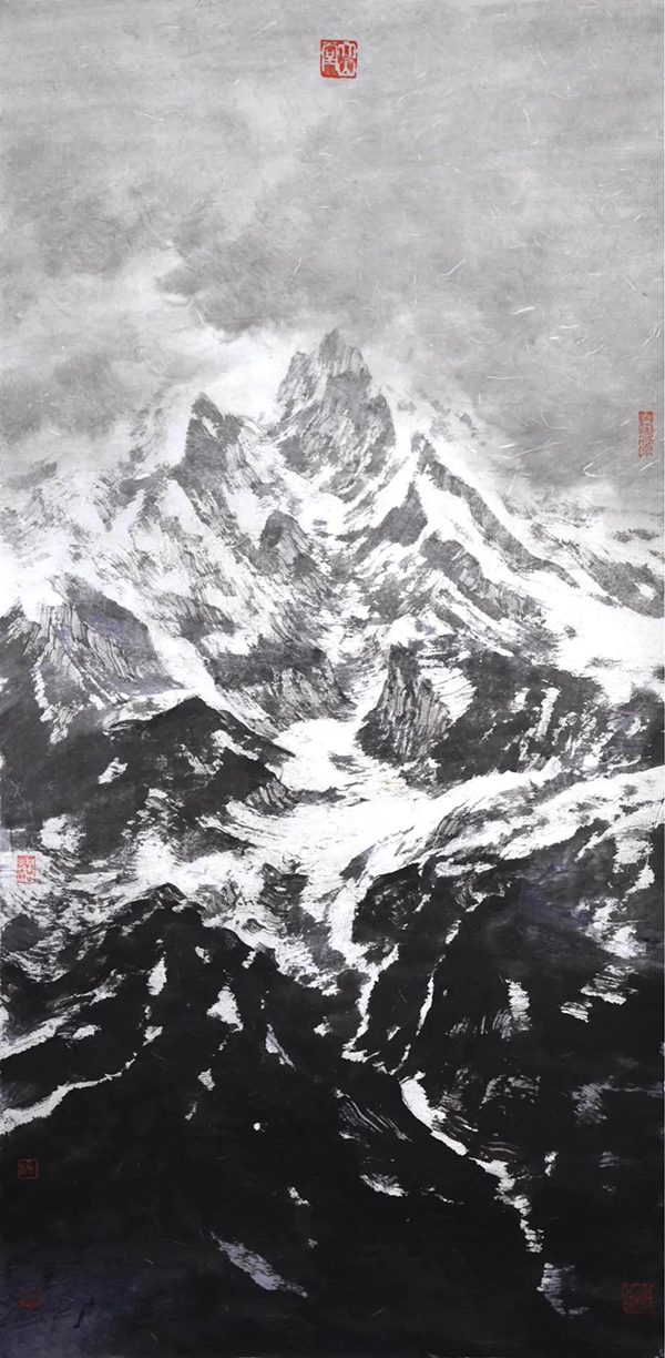 肖映川、楊進(jìn)民、張明川、陳芳桂四位畫家,都有從軍經(jīng)歷,有些還是現(xiàn)役軍人,又都師從于李寶林先生,對于蒼莽、雄強、峻偉、荒寒的西北大山水,陡然能起“男兒何不帶吳鉤,收取關(guān)山五十州”的壯志豪情。他們筆下的西部山水,已然超越了中國美術(shù)史的經(jīng)驗,超越了關(guān)隴山水為極限的所謂北派山水,目光掠過秦嶺,直探地球第三極和有“萬山之祖”稱號的帕米爾高原!這是人煙罕至的絕地,許多地域被稱為“人類禁區(qū)”,文明不曾染指,所以也稱為地球最后的凈土。這樣的對象,是中國山水畫的新課題。從知識的角度看,它們已經(jīng)不屬于人類的盲區(qū),但如何經(jīng)由畫家的心眼化其為藝術(shù)的心象,賦其以圖式的表達(dá),且以筆墨奪其山魂水魄,然后造化在乎手,將人類文明的化外之域,化為紙上丘壑煙云與筆墨圖式,映照人類永無止境的探險精神和求索心性,開拓人類在空間視域的經(jīng)驗與新的表達(dá)能力,就是畫家們的藝術(shù)使命了。我欣喜地看到四位有軍人氣質(zhì)的山水畫家在這片絕地上的頑強開拓,他們筆下的每一座寒光凜凜的冰峰,每一道深不見底的大壑,每一片靈異的天空,每一塊亙古的頑石,都給我靈魂的震撼,讓我對造化充滿敬畏并心生感激。天覆地載,天地有大美而不言。誠哉斯言!