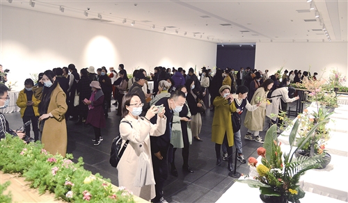 在美術(shù)館舉辦花展,是徐州美術(shù)館對不同藝術(shù)品類展覽的又一次拓展與探索。開幕式當(dāng)天,數(shù)百位觀眾在美術(shù)館的花海中賞花、拍花,流連忘返,從中國風(fēng)的插花藝術(shù)中獲得傳統(tǒng)文化的滋養(yǎng)。