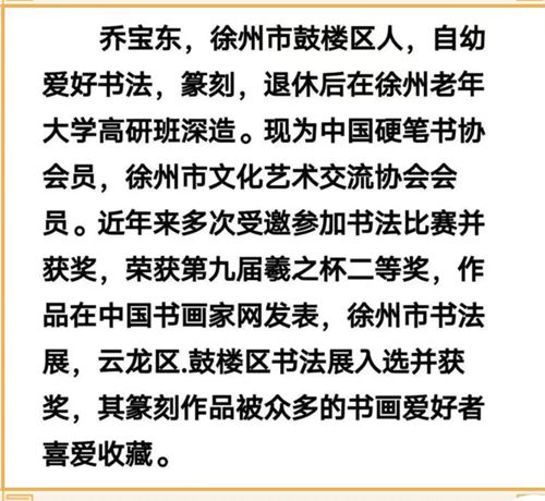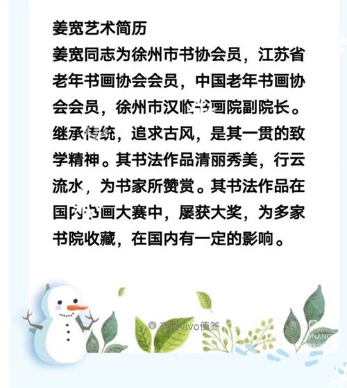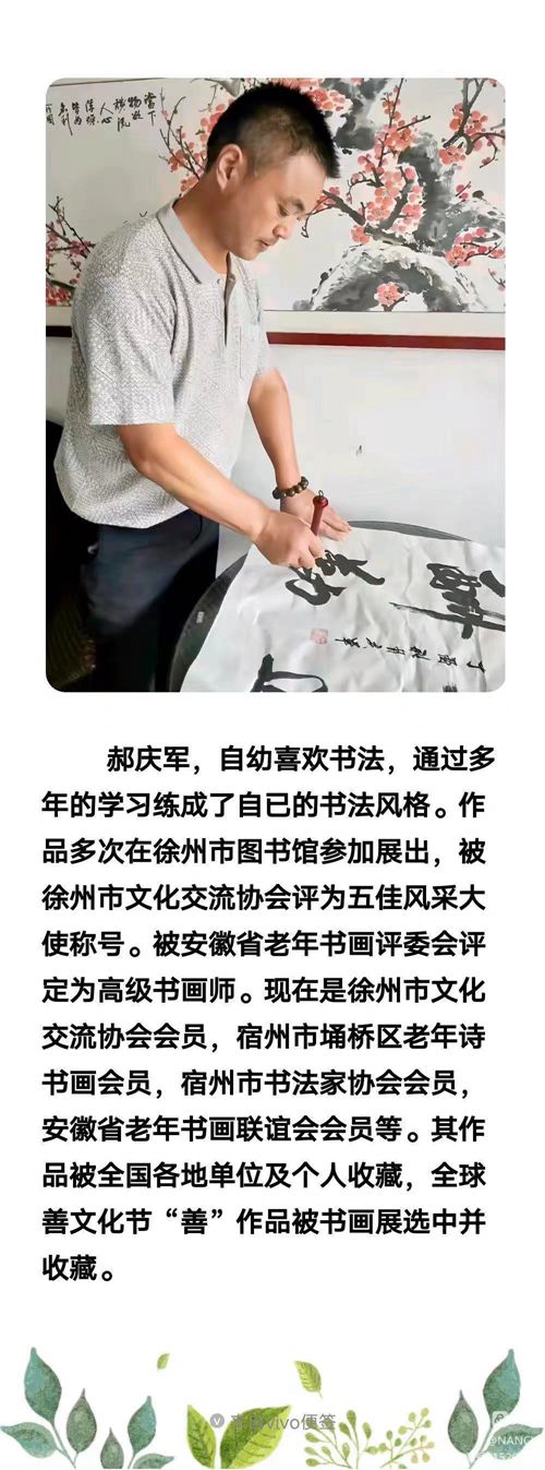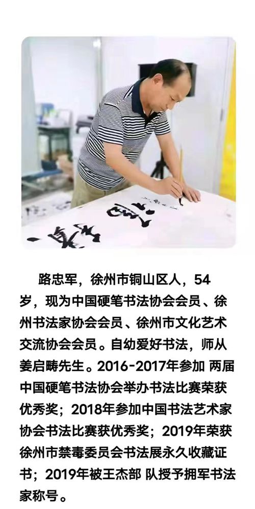 姜磊 中醫(yī)世家,自幼酷愛(ài)書(shū)法。幾年不斷臨帖,書(shū)法功底深厚。作品多次在省、市及全國(guó)書(shū)法大展中獲獎(jiǎng)!積極參加各種公益活動(dòng),被王杰部隊(duì)授予《擁軍書(shū)畫(huà)家》稱(chēng)號(hào),F(xiàn)是徐州市書(shū)協(xié)會(huì)員;徐州市文化藝術(shù)交流協(xié)會(huì)銅山區(qū)分會(huì)會(huì)員。