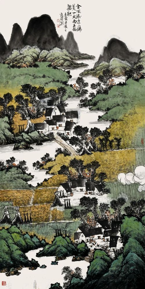 劉運(yùn)君 《金風(fēng)染透山鄉(xiāng)美 一水兩岸稻粱肥》 193cmX96cm