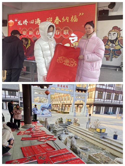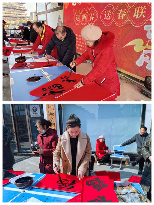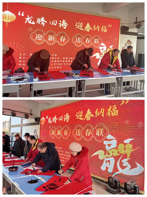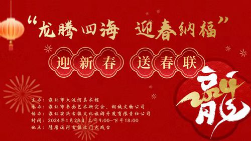 黃淮網(wǎng)(宋 梅) 1月28日,淮北市大運(yùn)河美術(shù)館聯(lián)合市書畫藝術(shù)研究會(huì)、相城文物公司、淮北安興古鎮(zhèn)公司開展“龍騰四海 迎春納福”春聯(lián)進(jìn)萬家活動(dòng)。