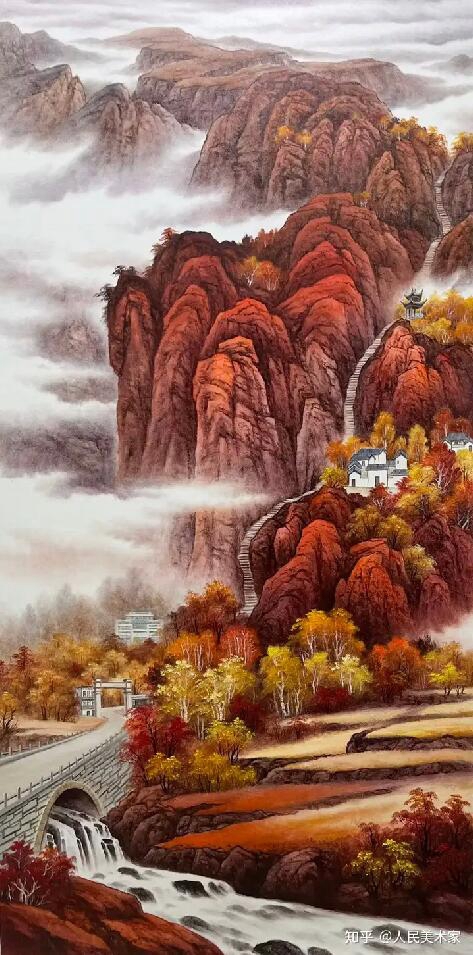 遠(yuǎn)處采用溫柔的筆觸繪出黛色山峰和升騰的水霧。萬(wàn)山紅遍,層林盡染與奔騰到海,一瀉千里。畫家把這兩個(gè)主題結(jié)合一起,捕捉到了大自然的萬(wàn)丈豪情。