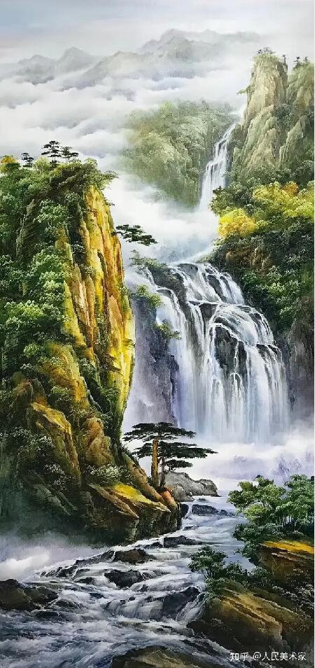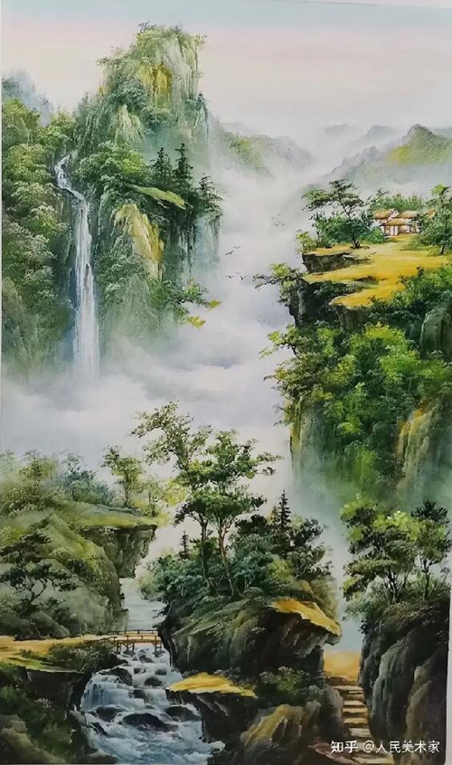 幽靜浪漫的溪流景色,讓心情平靜下來(lái)。畫家通過滿眼的青綠色來(lái)表現(xiàn)一種山清水秀,空氣清新的抒情畫面。