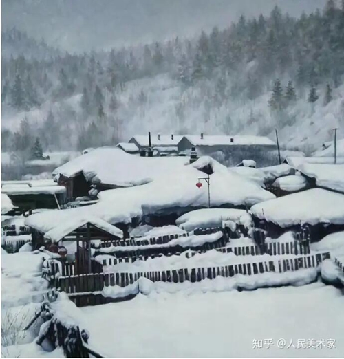 冬季風(fēng)景,北鴻大師用精心處理的構(gòu)圖,細(xì)致的筆觸,變化微妙的色彩描繪出來(lái),并捕捉到寒冷中的一抹帶來(lái)生機(jī)的暖意,使風(fēng)景畫十分生機(jī)勃勃。