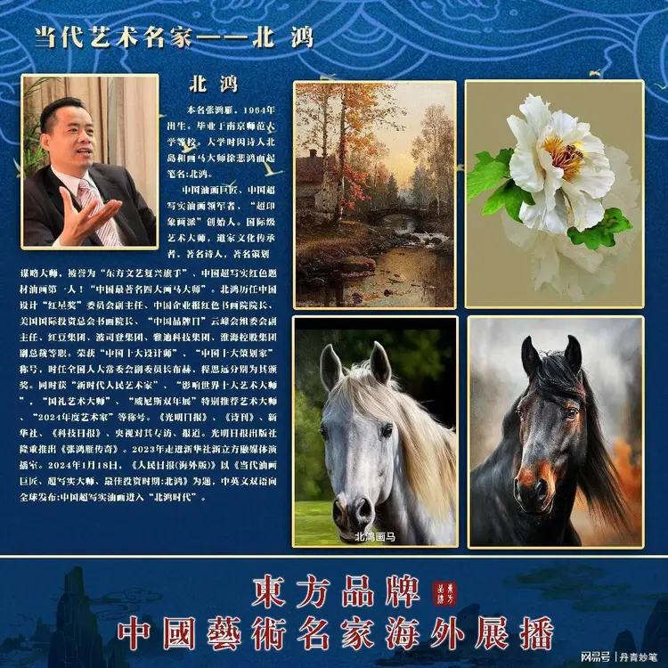 中國油畫巨匠、中國超寫實油畫領(lǐng)軍者、“超印象畫派”創(chuàng)始人。國際級藝術(shù)大師,道家文化傳承者,著名詩人,著名策劃謀略大師,被譽為“東方文藝復(fù)興旗手”、中國超寫實紅色題材油畫第一人!“中國最著名四大畫馬大師”本名張鴻雁,1964年出生。張良、張道陵后裔。胡適入室再傳弟子。畢業(yè)于南京師范大學(xué)等校。研究生畢業(yè)后留高校任教。大學(xué)時因詩人北島和畫馬大師徐悲鴻而起筆名:北鴻。