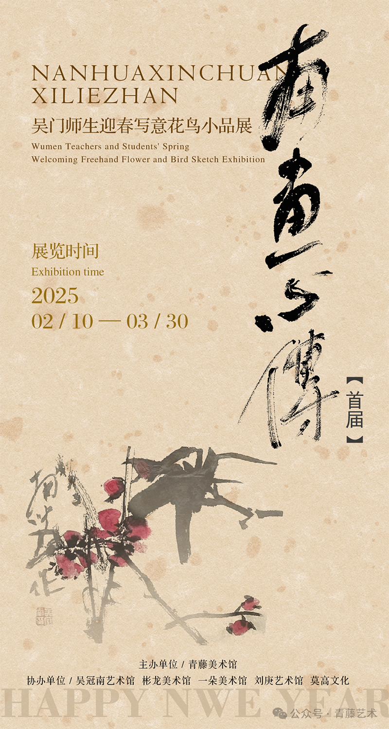 青藤美術(shù)館作為藝術(shù)傳承與文化交流的重要平臺,始終秉持著對傳統(tǒng)藝術(shù)的敬畏之心與對學術(shù)研究的嚴謹態(tài)度。值此新春佳節(jié)之時,攜手吳門師生,以筆墨丹青為媒介,共同傳遞新春的美好祝福與對藝術(shù)的崇高敬意。此次首屆“南畫心傳”—2025年吳門師生迎春寫意花鳥小品展,不僅是對書畫藝術(shù)傳承脈絡的深入梳理與文化精神的深刻闡釋,更是對吳門師生在書畫領(lǐng)域創(chuàng)新探索與階段性藝術(shù)實踐成果的一次展示。我們期待通過此次活動,進一步推動吳冠南藝術(shù)的學術(shù)研究與發(fā)展,為學術(shù)界與廣大藝術(shù)愛好者呈現(xiàn)一場視覺與思想的雙重盛宴。