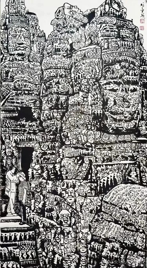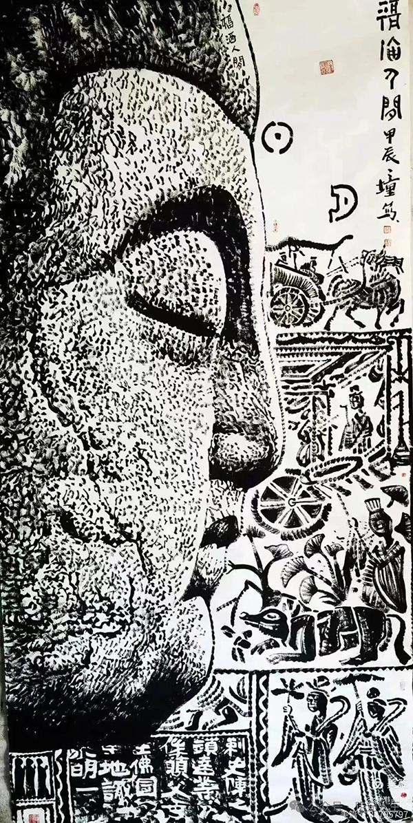 陳傳席指著一幅焦墨佛像,眼睛里閃著光:“你看他這線條,有的是刻石皴,有的是毛毛蟲皴!把毛毛蟲的卷曲感變成筆意,這腦洞,絕了!” 更絕的是,他還把古錢、佛像甚至埃及文物的元素,都當成皴法用進畫里——別人畫畫是“創(chuàng)作”,他是把古今中外的文化符號“煮”成了一碗藝術濃湯!
