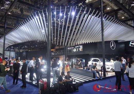 奔馳展臺充滿藝術范兒,黑色基調(diào)配上白色線條元素,隱隱能看到鋼琴黑白鍵的感覺,藝術之余還顯時尚。