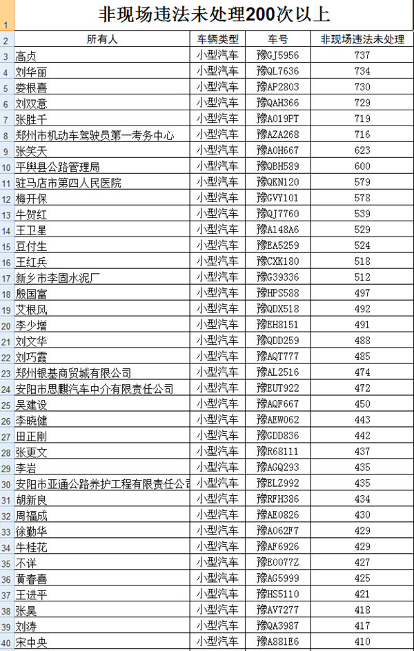 名單中排前六位的均為個人車主,其中車主登記為高貞的豫GJ5956轎車累計違章737次未處理,奪得“賴賬狀元”。