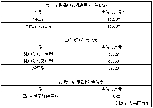 人民網(wǎng)成都9月2日電(鄂智超)日前,在“2016 BMW新能源家族之夜”上,寶馬中國正式宣布了旗下的7系插電式混合動力版、i3升級版以及i8質(zhì)子紅限量版正式上市,各車型具體售價如下表。今后,寶馬旗下的新能源車都將統(tǒng)一劃歸iPerformance車系。