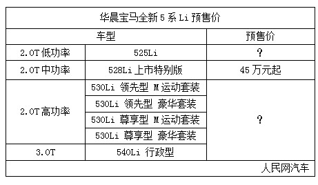 人民網(wǎng)北京5月16日電(鄂智超),近日,華晨寶馬公布了即將在6月上市的全新5系Li車型的預售價,其中528Li上市特別版預售價為45萬元,首批上市的車型還將包括四款530Li以及一款540Li車型,共六款。