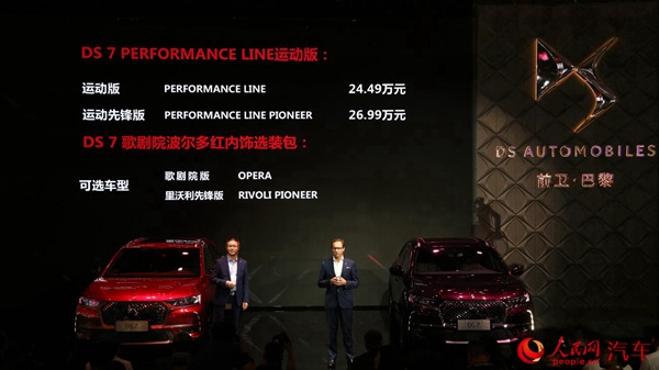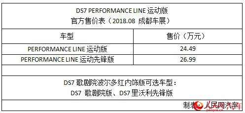 人民網(wǎng)成都9月1日電(鄂智超)在2018成都國際車展上,DS品牌旗下DS7車型正式推出 PERFORMANCE LINE運動版,售價區(qū)間為24.49萬至26.99萬元。同時,DS7歌劇院波爾多紅內(nèi)飾版(選裝包)也正式推出。