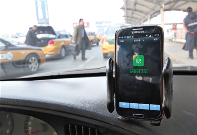 2014年2月17日,首都機(jī)場(chǎng)第二航站樓出租下客區(qū),一輛出租上的司機(jī)用手機(jī)使用打車軟件。新京報(bào)記者 尹亞飛 攝