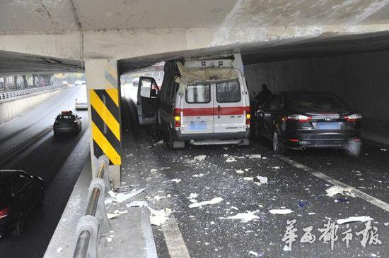 原標題:成都一救護車過橋遭削頂 輪子放氣仍出不來