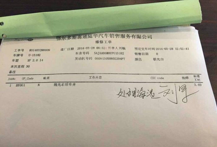 維修記錄里顯示,當(dāng)時車輛已經(jīng)有了216公里的里程數(shù),鄂爾多斯惠通陸華捷豹4s店稱是員工錄入錯誤所致。江先生表示無法接受這個說法,一般新車最多也只是有幾十公里的里程,這輛車動輒200多公里,完全有理由懷疑不是新車。但是在補開的拋光處理的工單上,車輛的里程又突然變成了30公里。