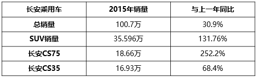長(zhǎng)安汽車作為乘用車市場(chǎng)的老將,其12月份產(chǎn)銷環(huán)比略有小幅下滑,但卻不影響全年快速增長(zhǎng)的走勢(shì)。2015年,長(zhǎng)安乘用車全年累計(jì)銷量100.7輛,同比增長(zhǎng)30.9%。從銷量構(gòu)成來(lái)看,其SUV板塊占比最大,占乘用車總銷量35.34%。