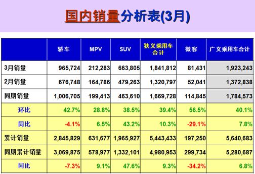 人民網(wǎng)北京4月13日電(吳曉琴)近日,全國乘用車聯(lián)席會(huì)公布了3月份國內(nèi)乘用車銷量數(shù)據(jù)?傮w來說,3月份乘用車產(chǎn)銷量同比增速超2月,其中SUV銷量同比增長43.2%,而轎車和微客分別下跌4.1%和29.1%。