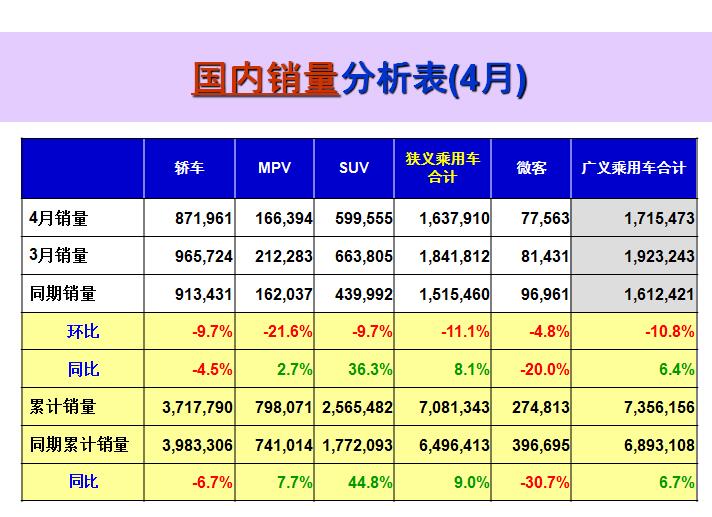 乘聯(lián)會(huì)數(shù)據(jù)顯示:4月,全國(guó)廣義乘用車?yán)塾?jì)銷量1,715,473輛,環(huán)比下降10.8%,同比增長(zhǎng)6.4%。其中,轎車銷量871,961輛,同比下降4.5%;SUV銷量599,555輛,同比增長(zhǎng)36.3%;MPV銷量166,394輛,同比增長(zhǎng)2.7%。