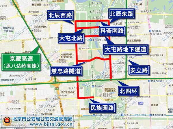 5月14日6時至當日活動結(jié)束,北辰東路,北辰西路,科薈南路,大屯北路,大屯路地下隧道,慧忠路地下隧道,民族園路,除持有“高峰論壇”專用證件的車輛外,禁止其他車輛通行。社會車輛和公交車經(jīng)安立路,京藏高速公路,北五環(huán)路,北四環(huán)路繞行。