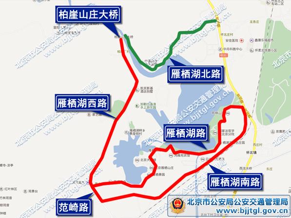 5月7日零時至5月15日活動結(jié)束,由懷柔區(qū)會都路范崎路口(不含)經(jīng)范崎路、雁棲湖西路至柏崖山莊大橋(不含),雁棲湖路,雁棲湖南路,除持有“高峰論壇”專用證件的車輛外,禁止其他車輛通行;社會車輛和公交車經(jīng)雁棲湖北路繞行,繞行路線沿線禁止停放機動車輛。