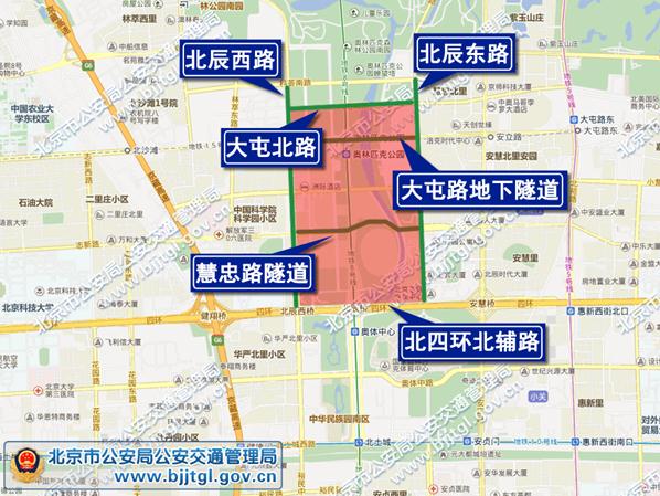 5月10日零時至15日活動結(jié)束,由北辰東橋經(jīng)北四環(huán)北輔路、北辰西路、大屯北路、北辰東路至北辰東橋(不含上述道路)區(qū)域內(nèi)道路,除持有“高峰論壇”專用證件的車輛外,禁止其他車輛通行;社會車輛和公交車經(jīng)大屯北路,大屯路地下隧道,慧忠路地下隧道,北辰西路、北辰東路繞行。