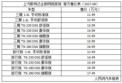 人民網(wǎng)上海8月23日電(鄂智超)日前,上汽斯柯達(dá)全新明銳家族正式宣布上市,本次新車加入了旅行版車型,同時(shí)三廂掀背車型也繼續(xù)保留,車系整體售價(jià)區(qū)間為11.99萬-17.49萬元。具體車型與售價(jià)請(qǐng)見下表。