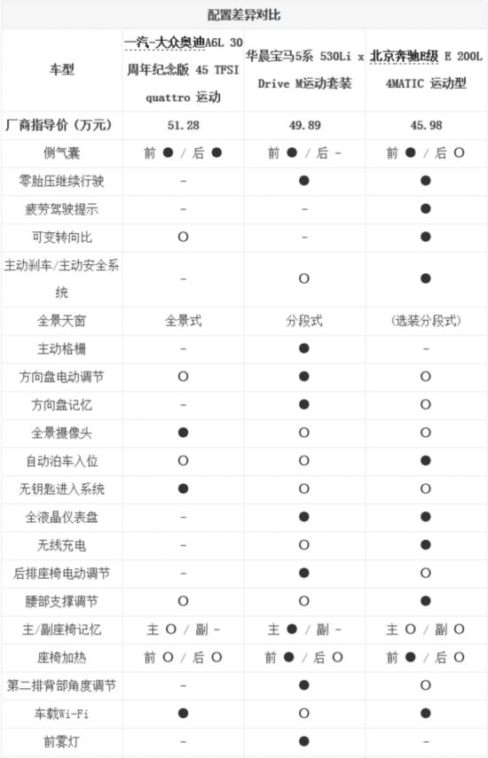 這次我們就選擇了A6L、5系和E級,這三款BBA的“掌門人”來過過招,具體車型分別是:一汽-大眾奧迪A6L 30周年紀(jì)念版 45 TFSI quattro 運(yùn)動、華晨寶馬5系530Li xDrive M運(yùn)動套裝和北京奔馳E級E 200L 4MATIC運(yùn)動型。需要說明的是雖然A6L的指導(dǎo)價最高,但是它目前全系都有著不小的市場優(yōu)惠,參與對比的A6L就有著接近十萬元的市場優(yōu)惠幅度。因此就車輛的終端價格來看,A6L相比5系和E級還是有優(yōu)勢的。