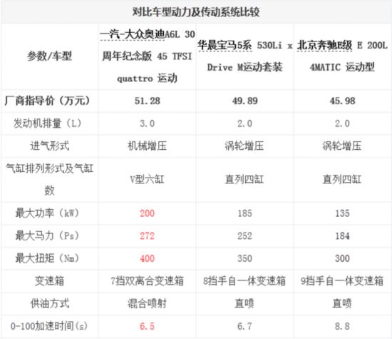 動力方面,A6L45 TFSI quattro 運(yùn)動型有著明顯優(yōu)勢,它搭載的3.0L機(jī)械增壓發(fā)動機(jī)能夠輸出200kW(272Ps)的最大功率和400Nm的最大扭矩。0-100km/h 6.5s的加速時間,也超過了參與對比的530Li和E200L。同時,V型六缸的發(fā)動機(jī)在日常駕駛時還能保證足夠的平順與靜謐性。