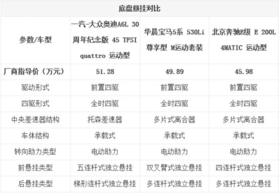 底盤方面,三輛車均采用全時四驅(qū)的四驅(qū)形式,在保證操控穩(wěn)定性的同時,提升了濕滑路面的行駛安全性。A6L具備的托森差速器在動力傳遞效率和可靠穩(wěn)定性方面,要優(yōu)于5系和E級使用的多片離合器結(jié)構(gòu)。三車都采用電動助力的助力類型,質(zhì)量輕,易于維護(hù)保養(yǎng),回正性能好。懸掛方面,對比車型都采用獨(dú)立懸掛,為良好的舒適性和操控性奠定了基礎(chǔ)。