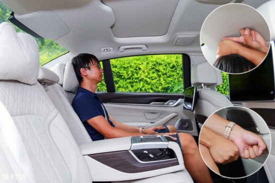 保持前排座椅位置不變,體驗者來到第二排,頭部空間還剩一拳一指,膝部空間兩拳。