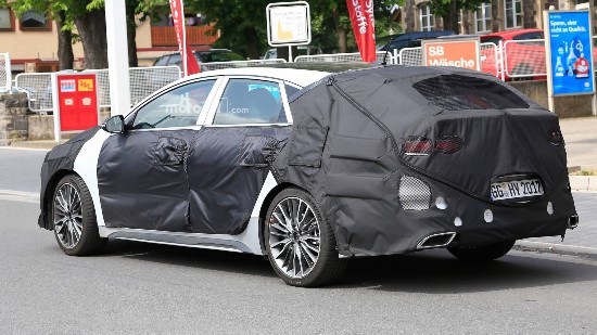 諜照中的原型車覆蓋在偽裝層下。車頭方面,僅可看到虎鼻格柵、LED前燈以及設(shè)計犀利的擴散器。該車的輪轂近似現(xiàn)代伊蘭特Sport,車頂輪廓線比概念車高。車尾方面,可看到傾斜的后窗及雙排氣管。設(shè)計圓滑的LED尾燈罩在偽裝層下。從諜照上看,該車似乎與概念車有很多相似之處。