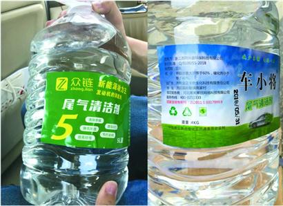 “眾鏈”的“動(dòng)力王水”尾氣清潔劑(左)和“車小將”尾氣清潔劑(右)。車佳楠 攝