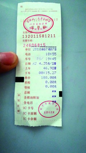 在距離不遠(yuǎn)的地下停車(chē)場(chǎng),陳先生坐上了一輛車(chē)牌號(hào)為“蘇A89×××”的出租車(chē)。車(chē)到了祿口機(jī)場(chǎng),他要求司機(jī)打發(fā)票時(shí)才發(fā)現(xiàn),發(fā)票上顯示行程一共46.9公里,共188元。