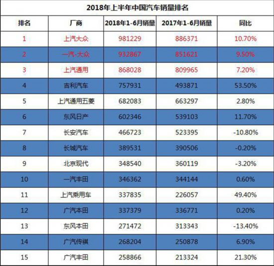 2018上半年汽車銷量排行 東風(fēng)本田下滑明顯