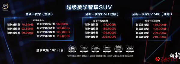 人民網(wǎng)成都8月31日電(王紫)8月30日,全新比亞迪宋正式上市,新車推出純?nèi)加、插電混?dòng)以及純電動(dòng)三種動(dòng)力共計(jì)15款車型。其中宋燃油版價(jià)格區(qū)間為7.98萬元-11.98萬元;宋DM補(bǔ)貼后價(jià)格區(qū)間為17.69萬元-20.69萬元;宋EV500補(bǔ)貼后價(jià)格區(qū)間為18.99萬元-21.99萬元。