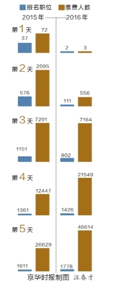 對(duì)比來(lái)看,2016年度報(bào)名第5天,報(bào)名人數(shù)與招錄人數(shù)競(jìng)爭(zhēng)比為6.8:1,而2015年度同期競(jìng)爭(zhēng)比為7.1:1,這次競(jìng)爭(zhēng)激烈程度略低于2015年。