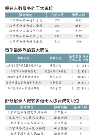 當(dāng)前報(bào)名繳費(fèi)成功最多的前10大職位,除北京市發(fā)改委以外,均來(lái)自公安系統(tǒng)。這與公安系統(tǒng)招錄總?cè)藬?shù)最多不無(wú)關(guān)系(北京市公安局招錄3290人,占總招錄人數(shù)的48%)。目前,通州公安分局的“公安執(zhí)法類(十八)職位”成為繳費(fèi)人數(shù)最多的職位,達(dá)3020人,該職位計(jì)劃招錄260人,競(jìng)爭(zhēng)比例為11.62:1。