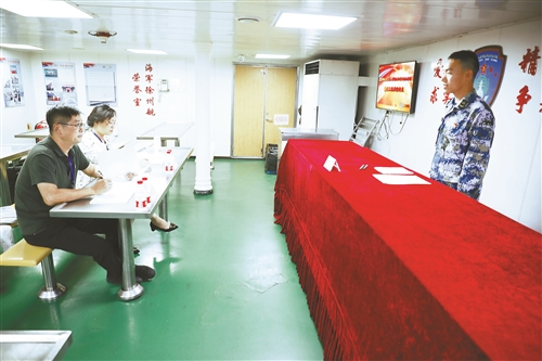 “各位考生!請按照點(diǎn)名順序依次參加面試環(huán)節(jié),每人5分鐘面試時間……”10月10日、11日下午,東部戰(zhàn)區(qū)海軍某驅(qū)逐艦支隊徐州艦的餐廳里,正在舉行一場特殊的考試。由徐州工程學(xué)院繼續(xù)教育學(xué)院的兩位考官,對徐州艦上34名今年報名2019年成人高考的官兵進(jìn)行面試和筆試。