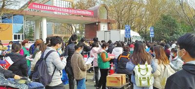 河南經(jīng)貿(mào)職業(yè)學(xué)院考點外考生在排隊等候進入考場