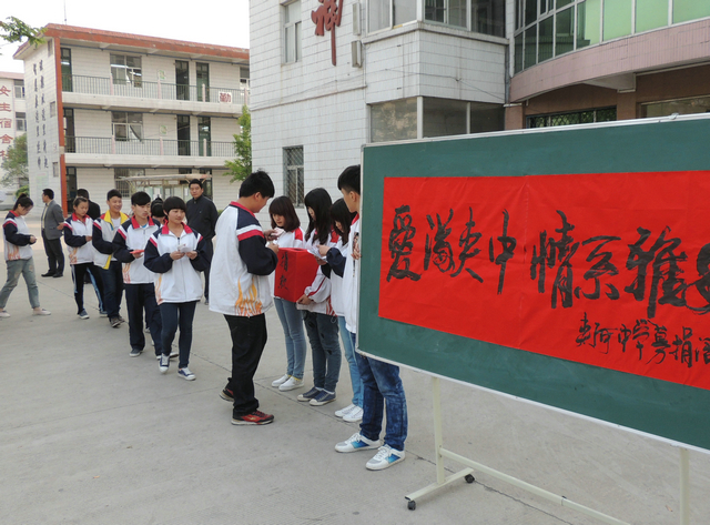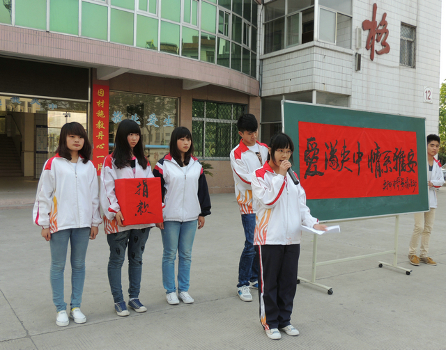 (中國黃淮網(wǎng)訊/郭云賓)5月2日,夾河中學(xué)校團委響應(yīng)團市委和團區(qū)委的相關(guān)號召,向全校團員青年發(fā)出“愛滿夾中情系雅安”捐款活動倡議,全校學(xué)生積極踴躍,主動為災(zāi)區(qū)人民捐款。在活動現(xiàn)場,學(xué)生代表宣讀了捐款倡議,夾河中學(xué)團委書記董祥武進(jìn)一步作了捐款動員,夾河中學(xué)校長王廣帥、副校長付化冰也親臨現(xiàn)場,觀摩了捐款全過程。
