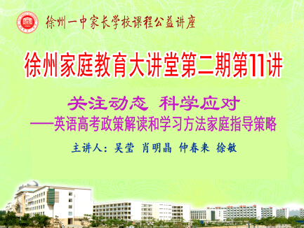 (本網(wǎng)訊)近日,徐州家庭教育大講堂(徐州一中家長(zhǎng)學(xué)校課程公益講座)第二期第十一講:“關(guān)注動(dòng)態(tài) 科學(xué)應(yīng)對(duì)——英語(yǔ)高考政策解讀和學(xué)習(xí)方法家庭指導(dǎo)策略”在一中夾河街校區(qū)毓秀樓禮堂開講,F(xiàn)場(chǎng)座無(wú)虛席。