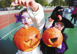 萬圣節(jié)的一個標志環(huán)節(jié)是“Trick or treat”(“不給糖就搗亂”),孩子們打扮成鬼精靈模樣,提著南瓜燈籠挨家討糖吃。操場上,孩子們手拿南瓜燈,戴上面具,穿著自己制作的服裝——狼人、白雪公主、科學怪人、美國隊長、勇士海盜、科學怪人、精靈異獸和外星來客紛紛出動……有人在臉上化了煙熏妝,打扮成女巫、精靈;還有的學生穿上了橘色的南瓜服,有的換上了天使裝,身后一對小翅膀,十分可愛。生動形象的萬圣節(jié)造型,在孩子們身上栩栩如生、分外閃亮。