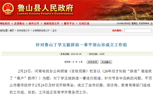 人民網(wǎng)北京2月26日電 據(jù)河南平頂山市魯山縣人民政府網(wǎng)站消息,2月23日,河南電視臺(tái)公共頻道《百姓觀察》欄目以《26年后才知被“辭退”誰造就了“黑戶”教師?》為題,對(duì)丁學(xué)玉被辭退一事進(jìn)行報(bào)道。針對(duì)節(jié)目中反映的問題,平頂山市委市政府于2月24日及時(shí)召開聯(lián)席會(huì),成立了由市紀(jì)委、信訪局、教育局等部門組成的工作組。目前,工作組正在有序開展各項(xiàng)工作。