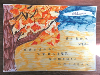 高年級(jí)同學(xué)走進(jìn)秋天,感受那份涼爽,品味秋天成熟的魅力。除此之外,他們還仔細(xì)品讀文學(xué)經(jīng)典中有關(guān)秋天的篇章、段落,在優(yōu)美的文學(xué)作品中,同學(xué)們感受到了秋天的韻味,秋天的風(fēng)、秋天的雨、秋天的陽光、秋天的景色,秋天的豐潤、成熟與寧靜……更重要是同學(xué)們發(fā)揮自己的想象,創(chuàng)作出了一首首精彩的詩歌,來表達(dá)對(duì)秋天的贊美與喜愛!