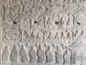 墓室前方有東西兩個(gè)墓闕,每個(gè)墓闕有七層畫面,東墓闕上端是東王公,西墓闕上端是西王母,兩者作為對(duì)偶神出現(xiàn)。東墓闕題材涉及拜謁饗宴、博局對(duì)奕、舞樂(lè)百戲,反映地上現(xiàn)實(shí)生活。