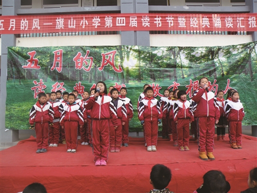 旗山小學(xué)一直以國(guó)學(xué)經(jīng)典誦讀為特色,成功舉辦了5屆“五月的風(fēng)”經(jīng)典誦讀現(xiàn)場(chǎng)活動(dòng),其中第三屆經(jīng)典誦讀活動(dòng)被省精神文明網(wǎng)、徐州教育網(wǎng)和賈汪信息網(wǎng)等多家媒體報(bào)道。“新年新詩(shī)會(huì)”和“五月的風(fēng)”是旗山小學(xué)孩子最喜愛(ài)參與的活動(dòng),學(xué)生們現(xiàn)場(chǎng)參與的功底和熱情贏得了家長(zhǎng)的交口稱(chēng)贊。每年五月份是旗山小學(xué)的讀書(shū)節(jié),學(xué)校開(kāi)展了多次讀書(shū)節(jié)活動(dòng),一屆比一屆活動(dòng)更豐富,形式更多樣,內(nèi)容更深入,效果更顯著;