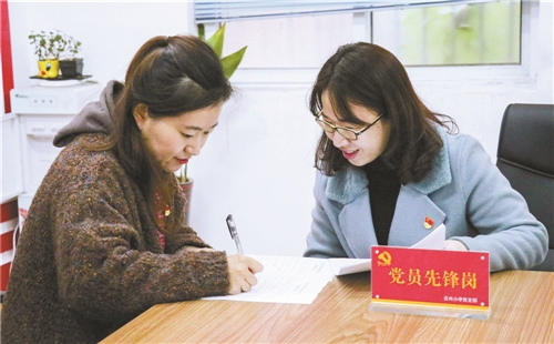 黨員老師在幫著家長(zhǎng)填寫作業(yè)輔導(dǎo)答疑表。