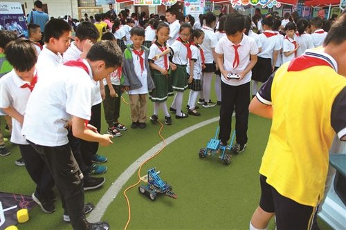 在操場(chǎng)上,一件件在草地上跑的機(jī)器人吸引了很多孩子的目光。這些機(jī)器人都是老師帶著孩子們一起進(jìn)行編程研發(fā)的?粗鴻C(jī)器人或跑、或退、或轉(zhuǎn)圈圈,孩子們都露出了羨慕的眼光。一個(gè)看起來只有一年級(jí)的孩子更是大聲地叫道:“這個(gè)太酷了!我也要學(xué)做機(jī)器人!”這就是公園巷舉辦科技節(jié)的目的所在吧:讓孩子接觸到科技,并愛上科技。