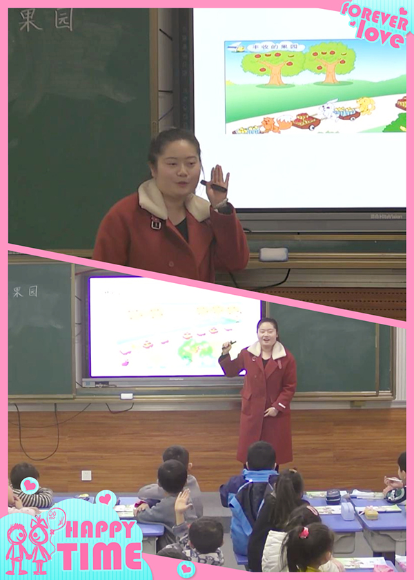 梁鈺珠老師執(zhí)教一年級上冊《豐收的果園》,從孩子們喜愛的青青草原入手,將果園的一幅畫與羊村的果園結(jié)合起來,讓學(xué)生在喜歡的情景中發(fā)現(xiàn)并提出數(shù)學(xué)問題、解決數(shù)學(xué)問題。以喜洋洋、沸羊羊、懶羊羊、村長等孩子們喜歡的動(dòng)畫成員的口吻引導(dǎo)學(xué)生學(xué)會觀察、積極思考問題、回憶之前所學(xué)知識并且培養(yǎng)初步的分析、推理能力。在羊村成員和學(xué)生們的互相提問并解決問題的過程中,學(xué)生進(jìn)一步積累數(shù)學(xué)活動(dòng)的經(jīng)驗(yàn),初步了解數(shù)學(xué)在現(xiàn)實(shí)生活中的應(yīng)用,學(xué)會與他人合作交流,體驗(yàn)學(xué)習(xí)數(shù)學(xué)的樂趣,增進(jìn)對數(shù)學(xué)的親切感。