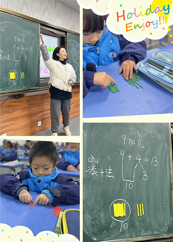 閆譯丹老師執(zhí)教一年級上冊《森林聯(lián)歡會——9加幾》,教學(xué)緊密聯(lián)系學(xué)生的生活實(shí)際,創(chuàng)設(shè)了闖關(guān)任務(wù),驅(qū)動(dòng)學(xué)生的過程。讓學(xué)生在活動(dòng)中學(xué)習(xí)數(shù)學(xué),親自體驗(yàn)知識的形成和發(fā)展。教學(xué)中留給學(xué)生充分發(fā)表想法的時(shí)間與空間,學(xué)生的思維是生動(dòng)活潑的,提出了多種9加幾的計(jì)算方法,這些算法都是學(xué)生在動(dòng)手操作、自主探索、合作交流中動(dòng)腦思考獲得的。